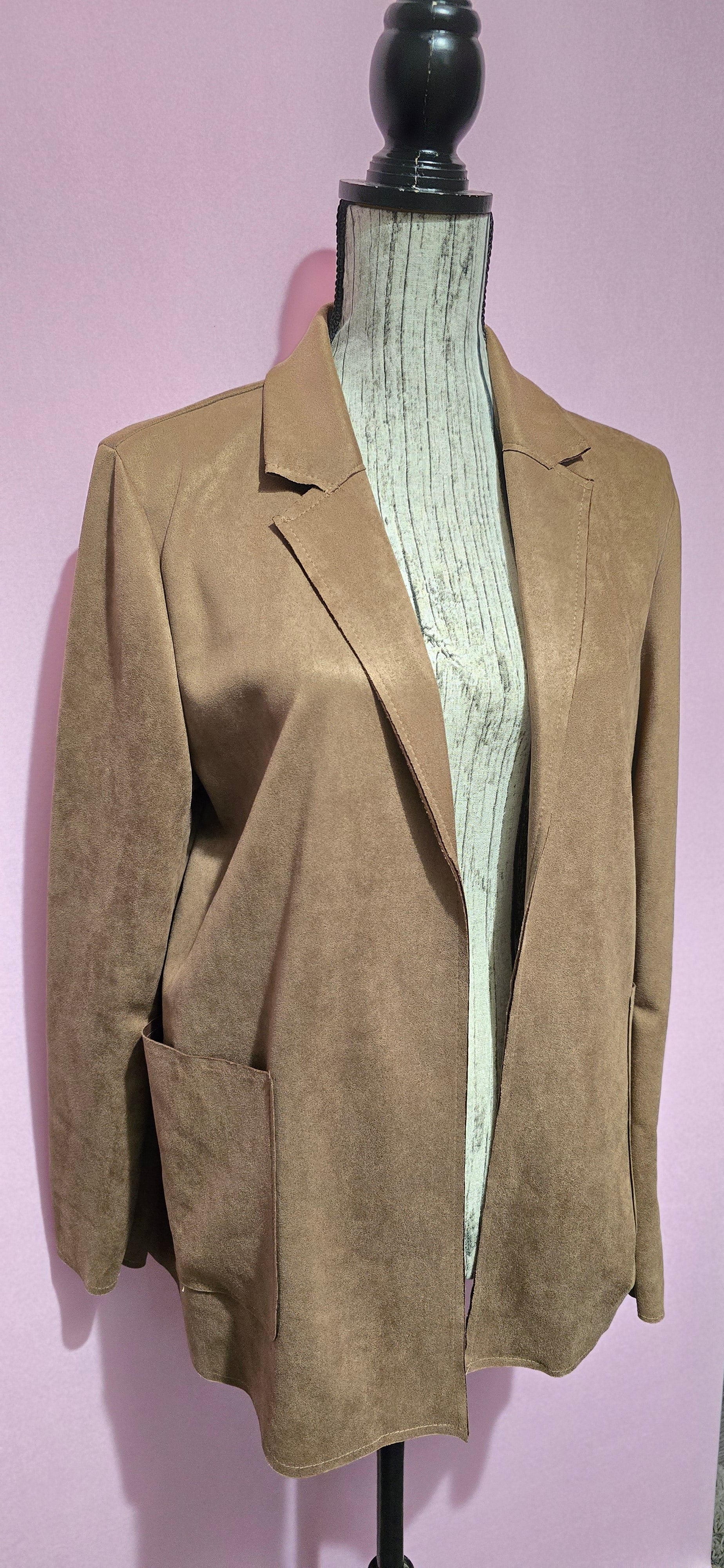 Design: Presenta un taglio open-front (senza bottoni) che cade in modo fluido, con revers classici e ampie tasche applicate sui fianchi.