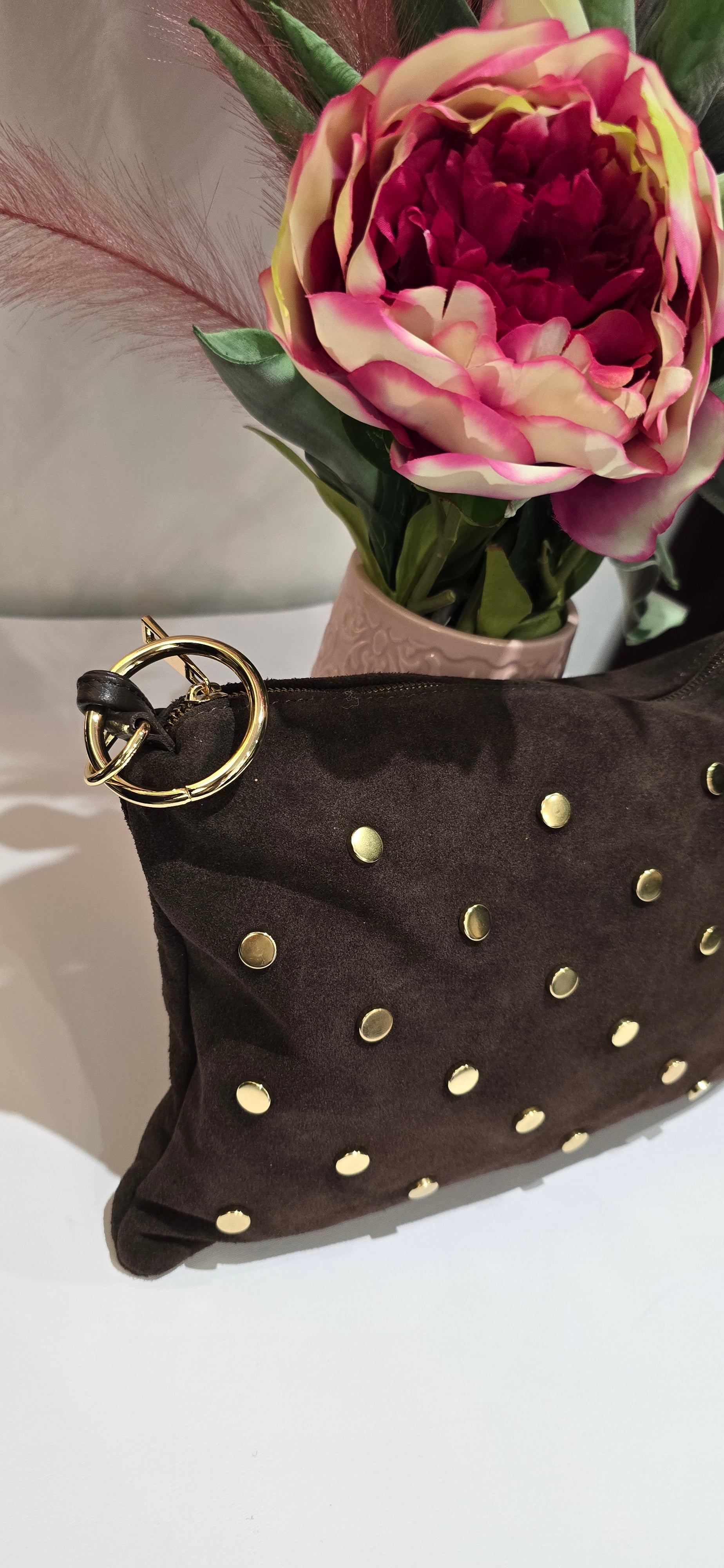 Questa borsa in vera pelle scamosciata unisce stile e funzionalità. Le borchie color oro aggiungono un tocco distintivo e moderno, mentre la tracolla regolabile in pelle permette di portarla comodamente a spalla o a tracolla, adattandosi a ogni esigenza di look e comfort. Perfetta per chi cerca un accessorio resistente e di carattere.
