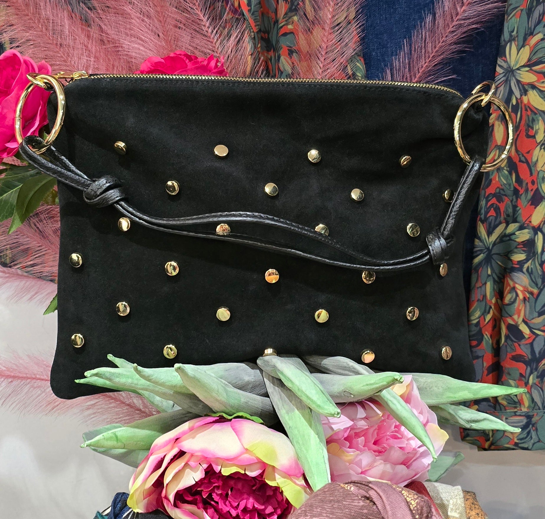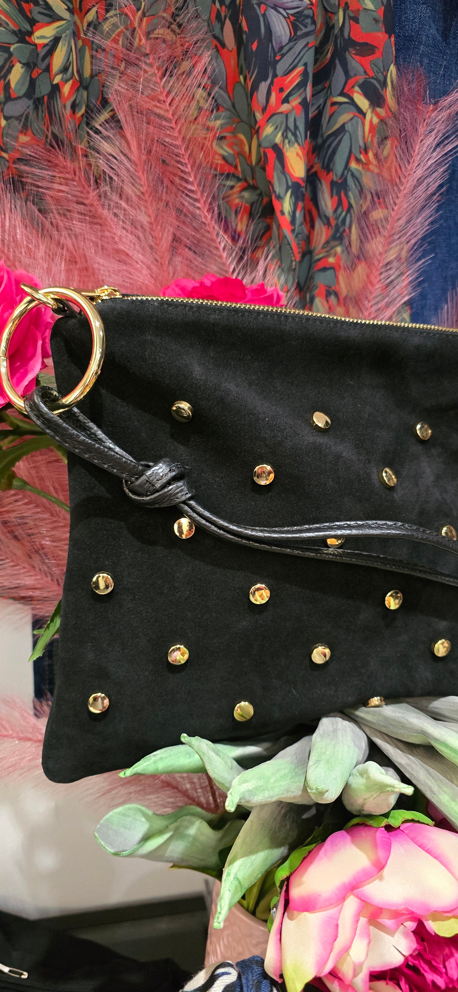 Questa borsa in vera pelle scamosciata unisce stile e funzionalità. Le borchie color oro aggiungono un tocco distintivo e moderno, mentre la tracolla regolabile in pelle permette di portarla comodamente a spalla o a tracolla, adattandosi a ogni esigenza di look e comfort. Perfetta per chi cerca un accessorio resistente e di carattere.