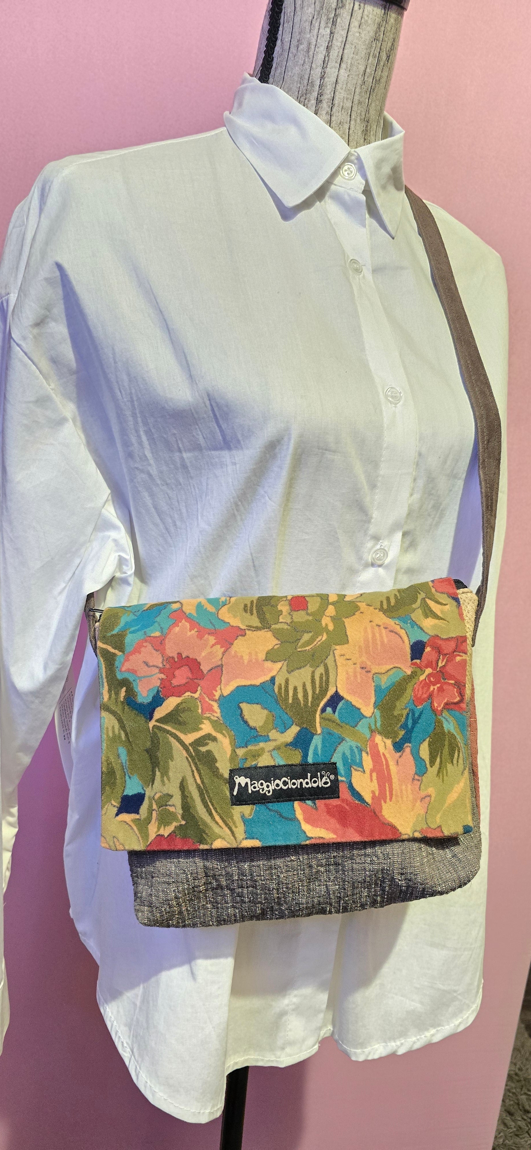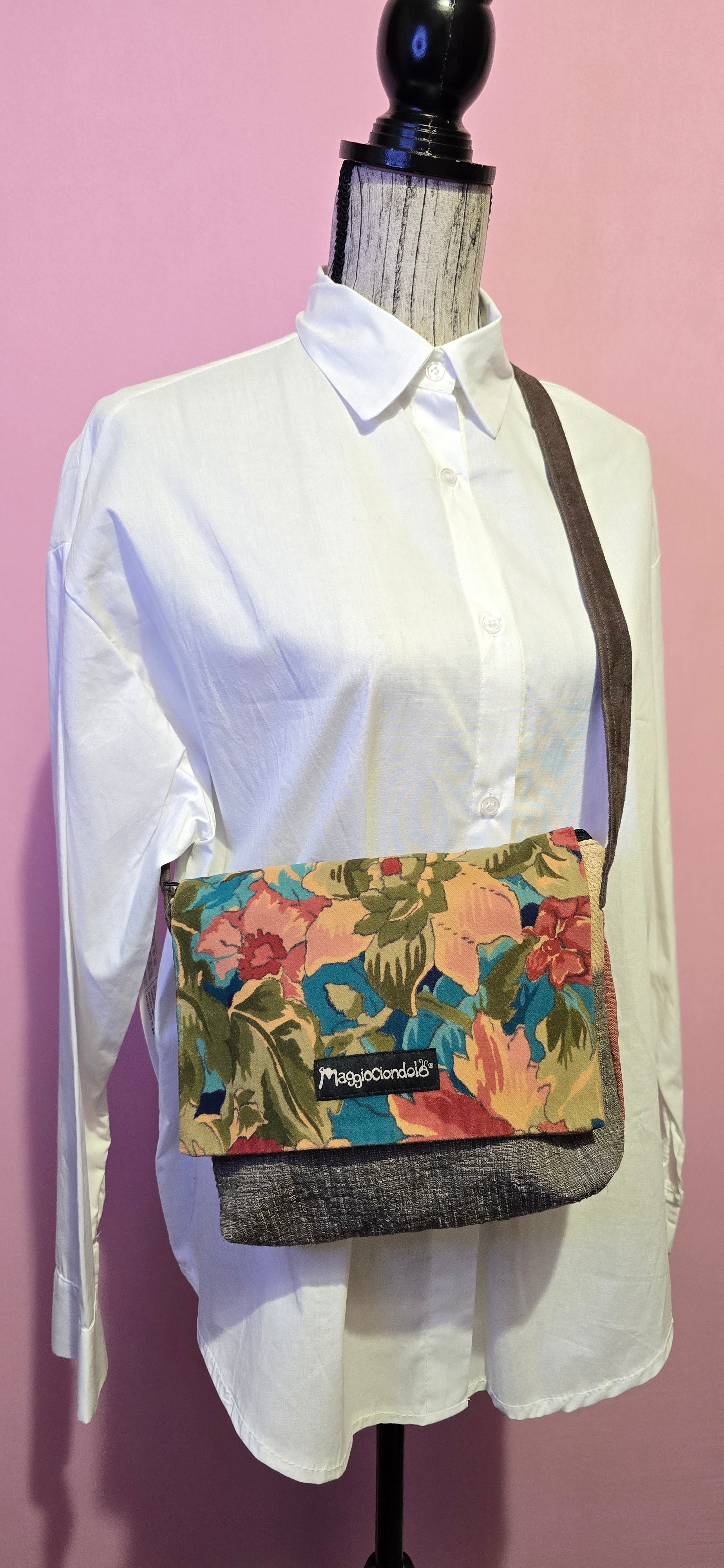 Abbiamo realizzato la borsa tracolla riciclo Chiara Maggiociondolo® con dei tessuti di recupero. La patta è realizzata con dei bellissimi tessuti di velluto di quelle che si facevano una volta e non si trovano più.