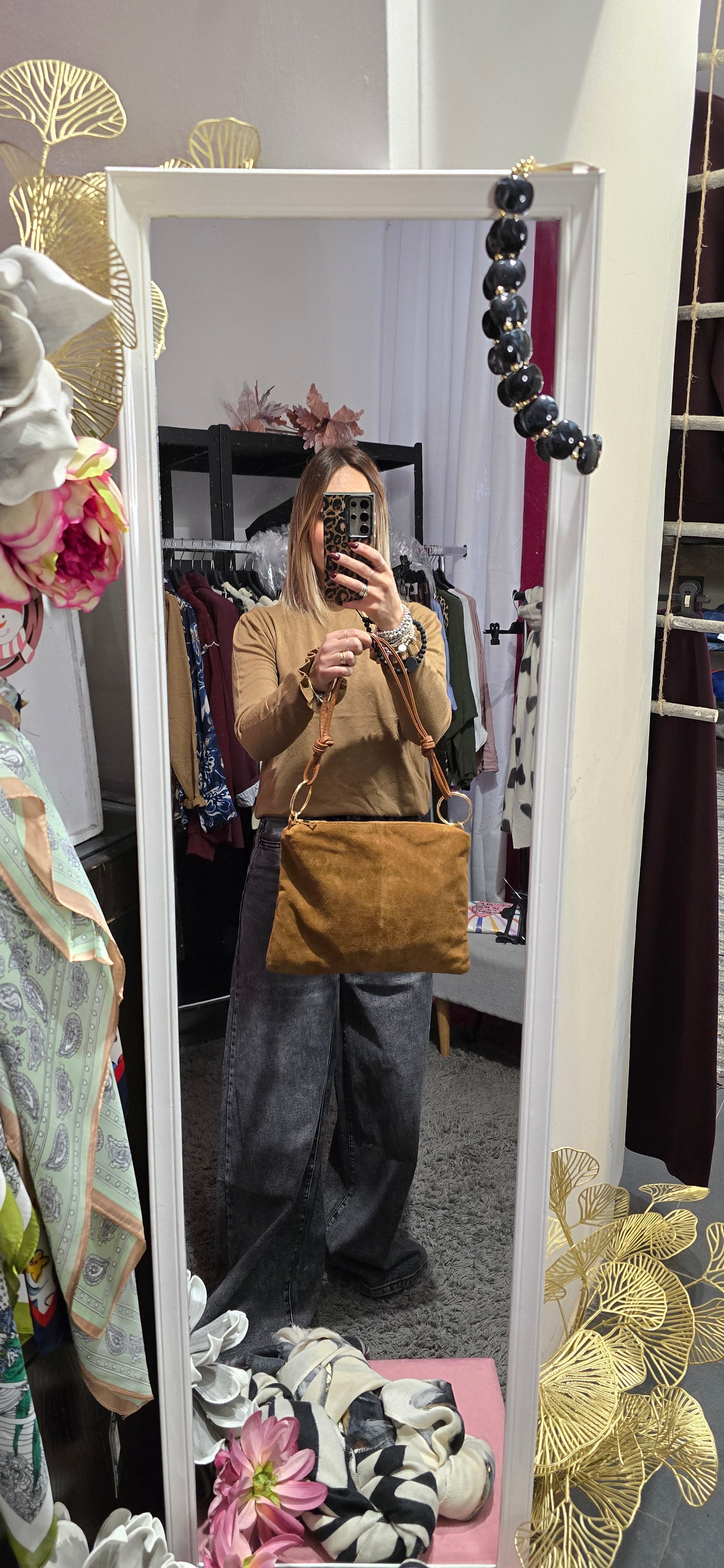 Borsa in pelle scamosciata , perfetta per chi ricerca eleganza e versatilità. Dotata di tracolla regolabile in tinta che consente di adattare la lunghezza alle tue preferenze, e di un pratico tracollino corto per indossarla comodamente a spalla. Il materiale morbido e raffinato la rende ideale per occasioni quotidiane e più formali. Una scelta sofisticata che completa qualsiasi outfit con stile.