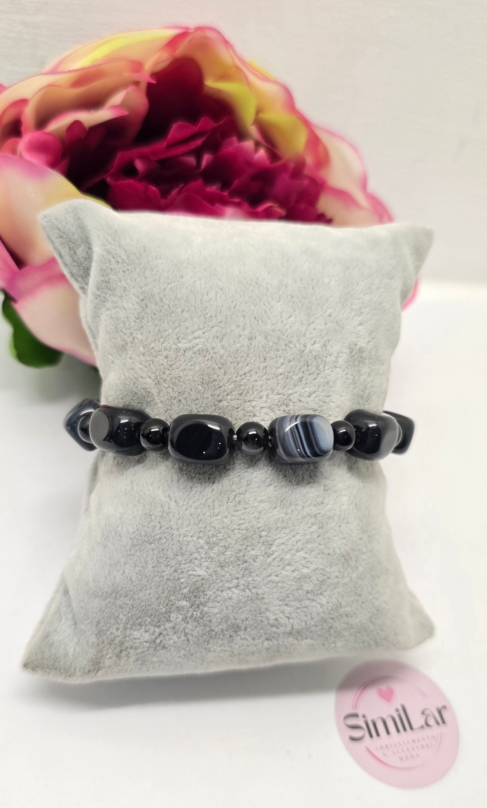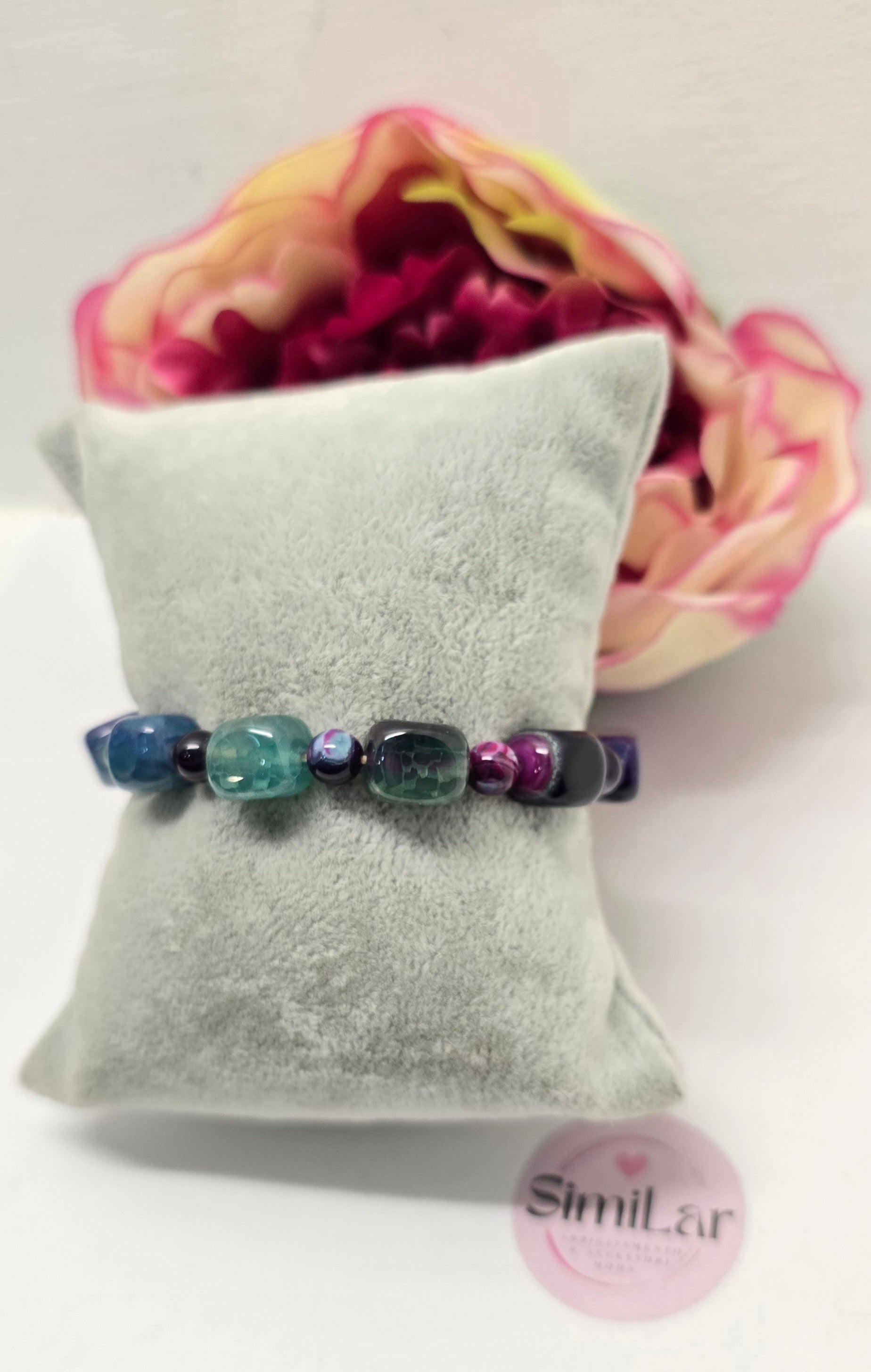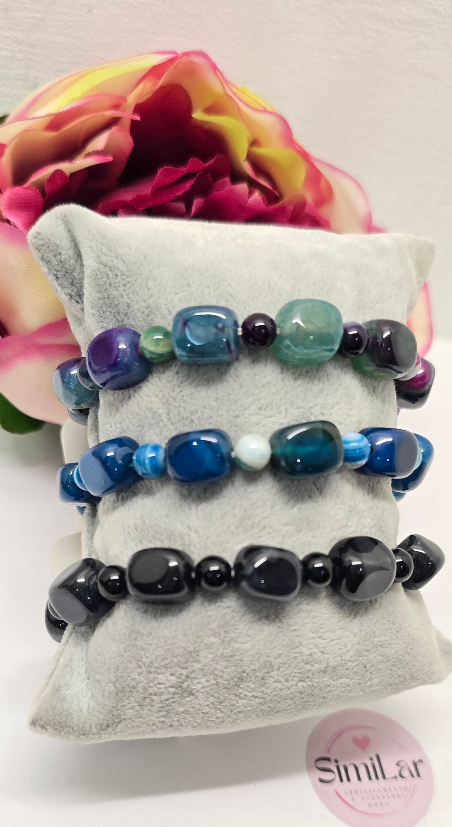 BRACCIALE ELASTICO COMPOSTA DA BARILOTTI MISURA 11X8MMN E SFERE LISCIE 6MM DI AGATA COLORATA. DIAMETRO 7CM.