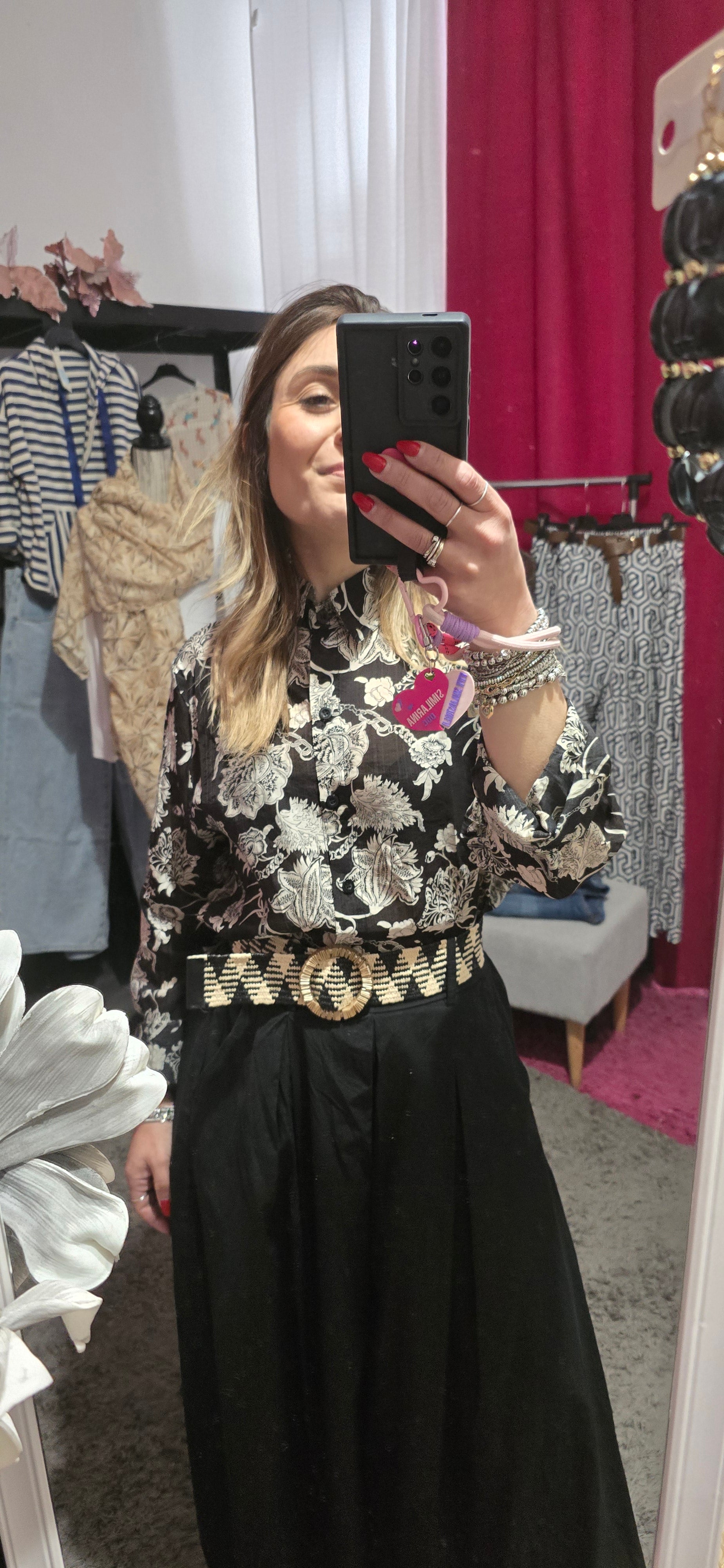 La camicia fiorata nera è realizzata in mussola di cotone leggera, caratterizzata da un design floreale su base nera e panna. Il colletto classico aggiunge un tocco di eleganza. Questo capo offre traspirabilità e comfort, ideale per un utilizzo quotidiano.