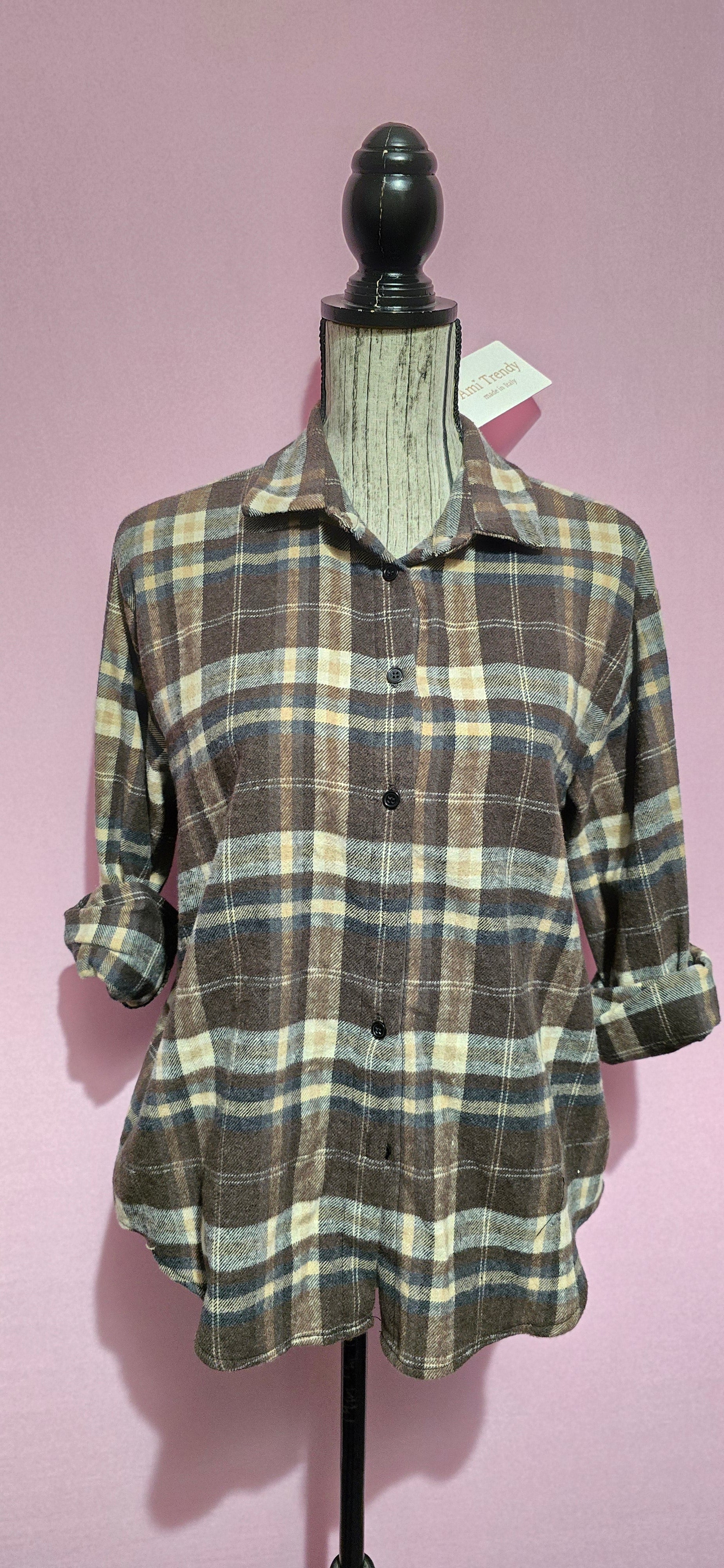 Camicia in morbida flanella con motivo a quadri nelle tonalità di moro, blu e panna. Il tessuto felpato garantisce calore e comfort, perfetto per le giornate più fredde. La vestibilità classica e il design senza tempo la rendono un capo versatile da indossare da solo o in abbinamento con altri pezzi del tuo guardaroba. Ideale per uno stile casual e accogliente.