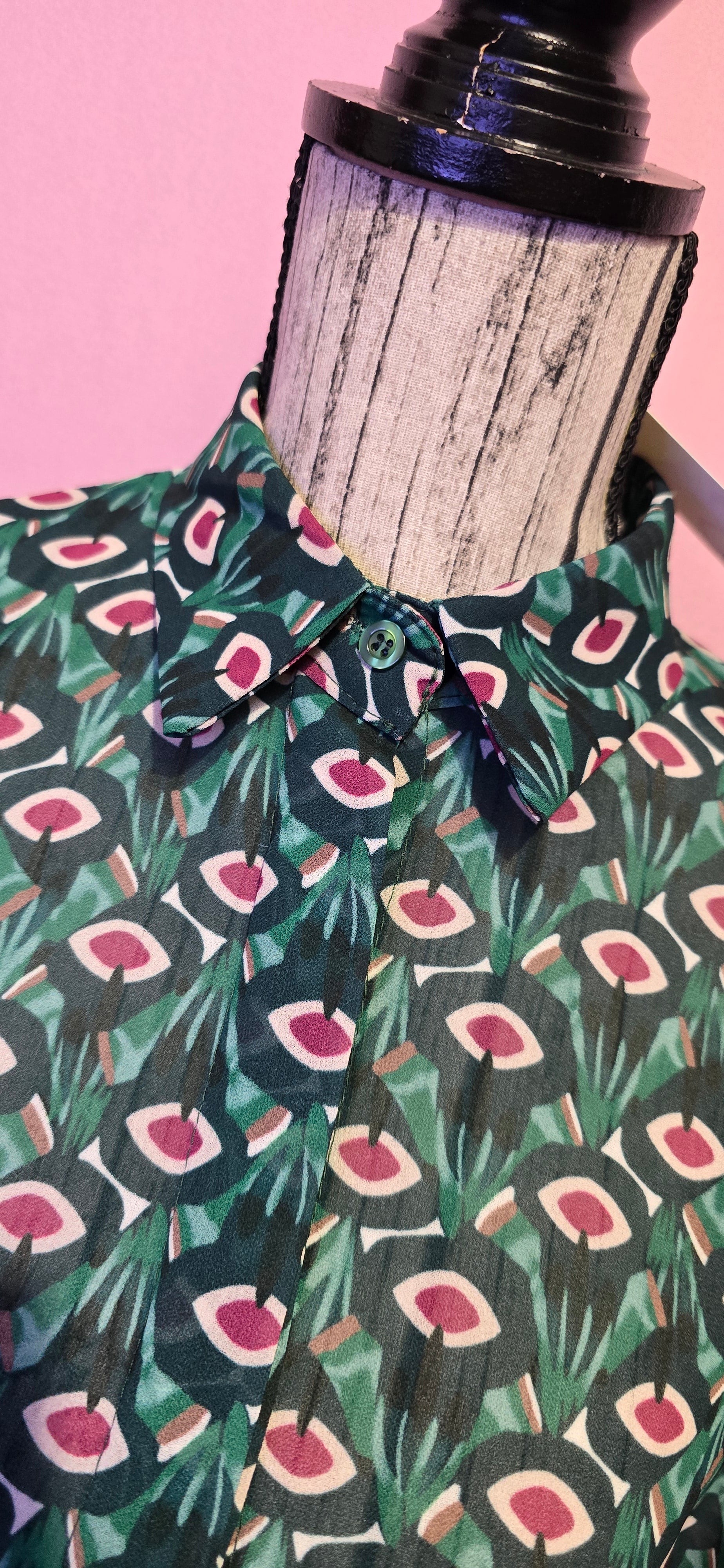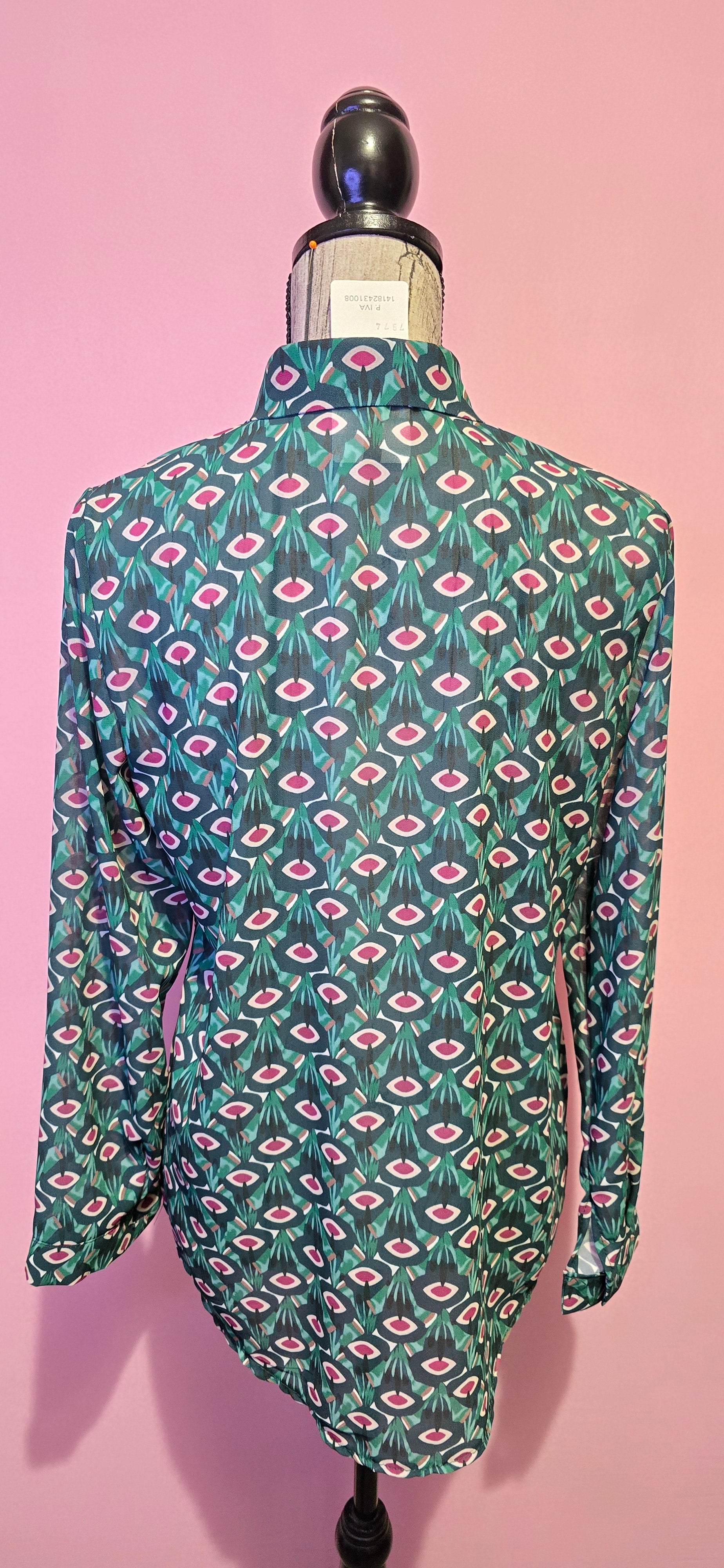 Camicia classica in fantasia verde fucsia con bottoni a scomparsa che garantisce un'eleganza discreta e sofisticata. Il modello versatile si adatta perfettamente a qualsiasi occasione, dal lavoro agli appuntamenti casual. La taglia unica veste comodamente fino a una 44, offrendo una vestibilità fluida e confortevole. Un capo essenziale che combina stile contemporaneo e praticità, perfetto per chi ricerca qualità e design senza compromessi.