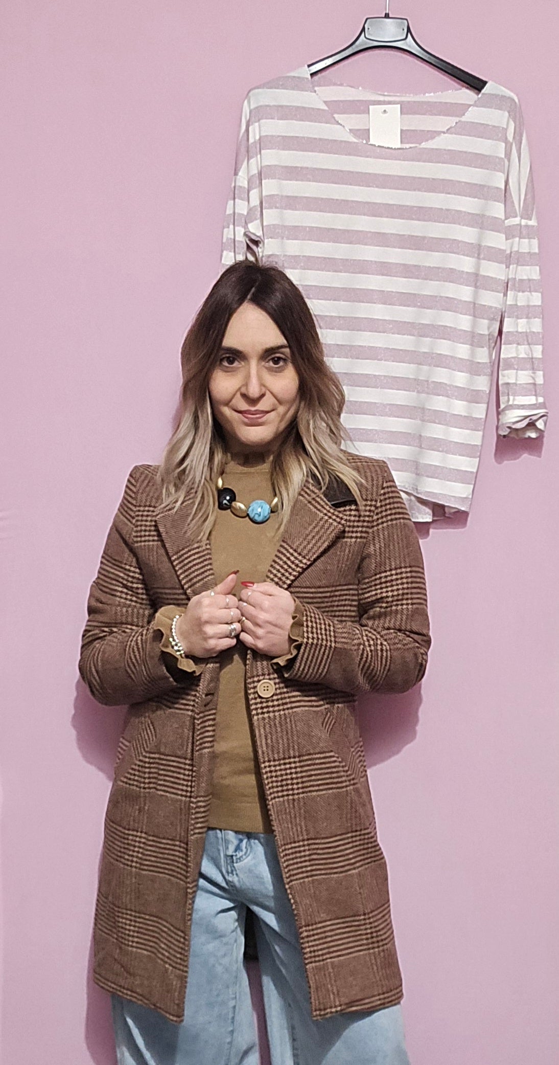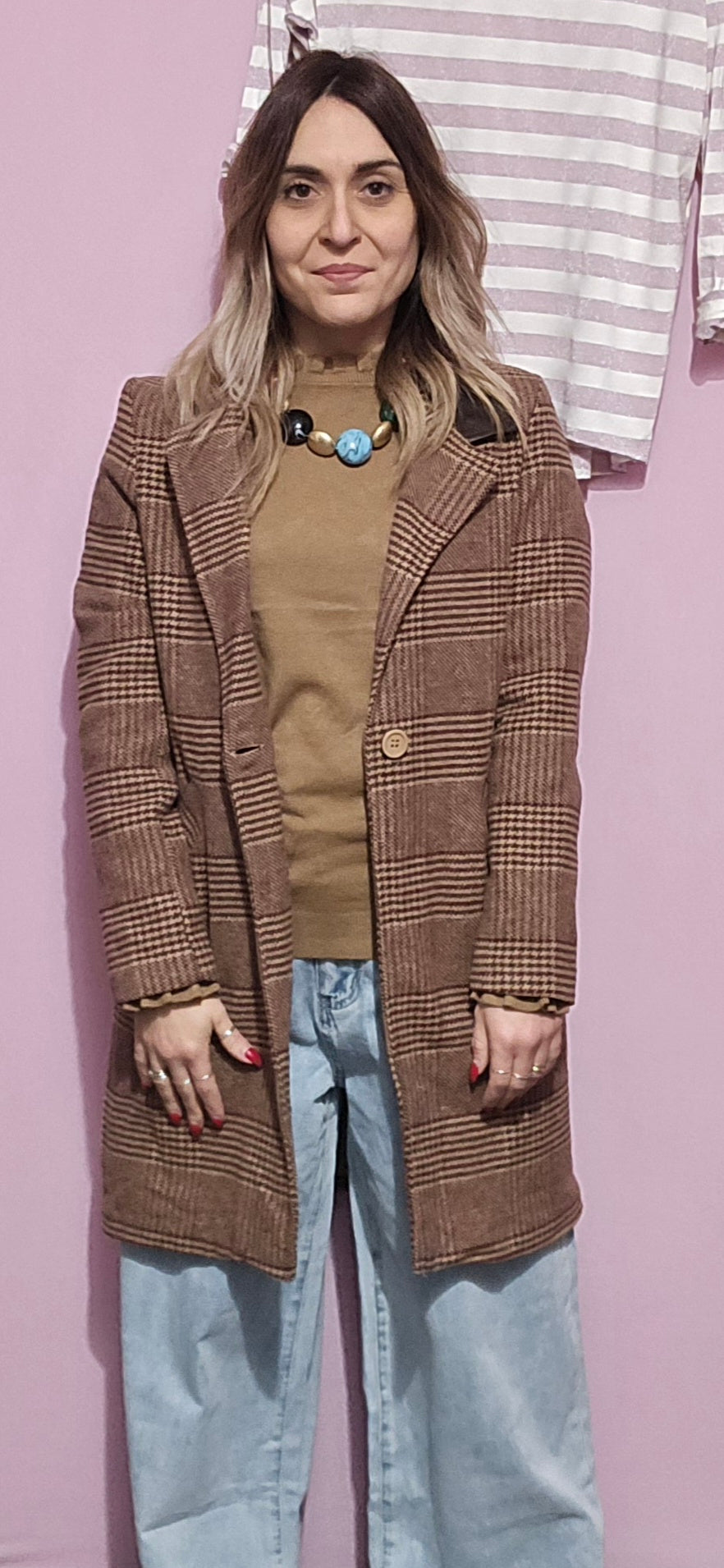 Il cappottino moro quadri presenta una fantasia a quadri ed è foderato, offrendo comfort e calore. Il colletto in ecopelle migliora non solo l'estetica, ma anche la resistenza agli agenti atmosferici. Questo capo è ideale per un uso quotidiano, combinando stile e funzionalità.