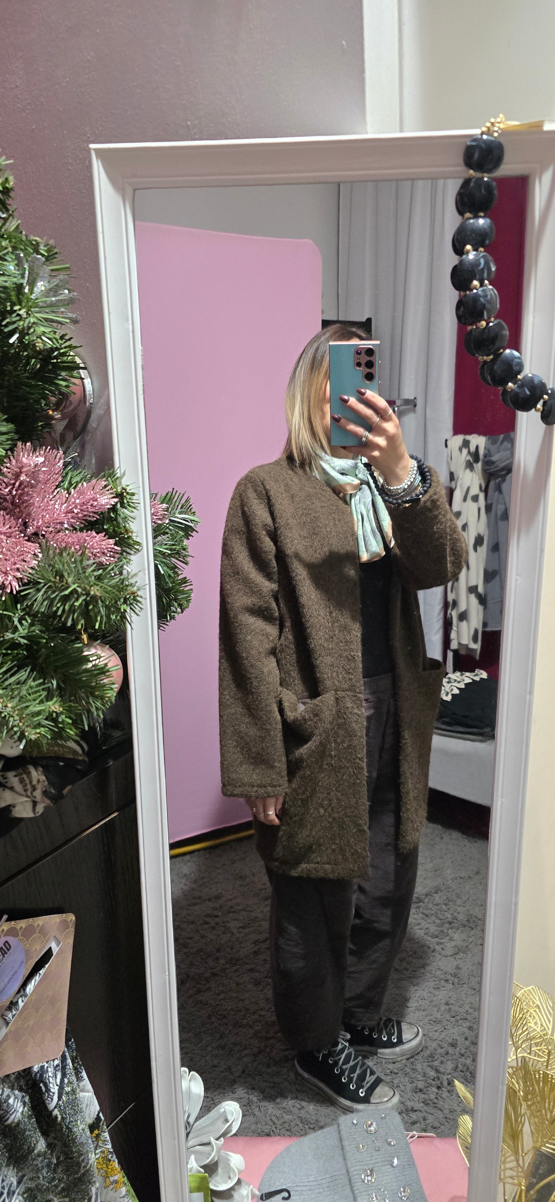Cappotto aperto in morbido bouclè che cattura lo sguardo con la sua texture ricercata e il colore moro sofisticato. Perfetto per stratificare il tuo look autunnale e invernale, questo capo versatile si adatta a molteplici occasioni, dal casual al più elegante. La vestibilità unica garantisce una silhouette fluida e confortevole. Un essenziale che non può mancare nel guardaroba di chi apprezza lo stile senza compromessi.
