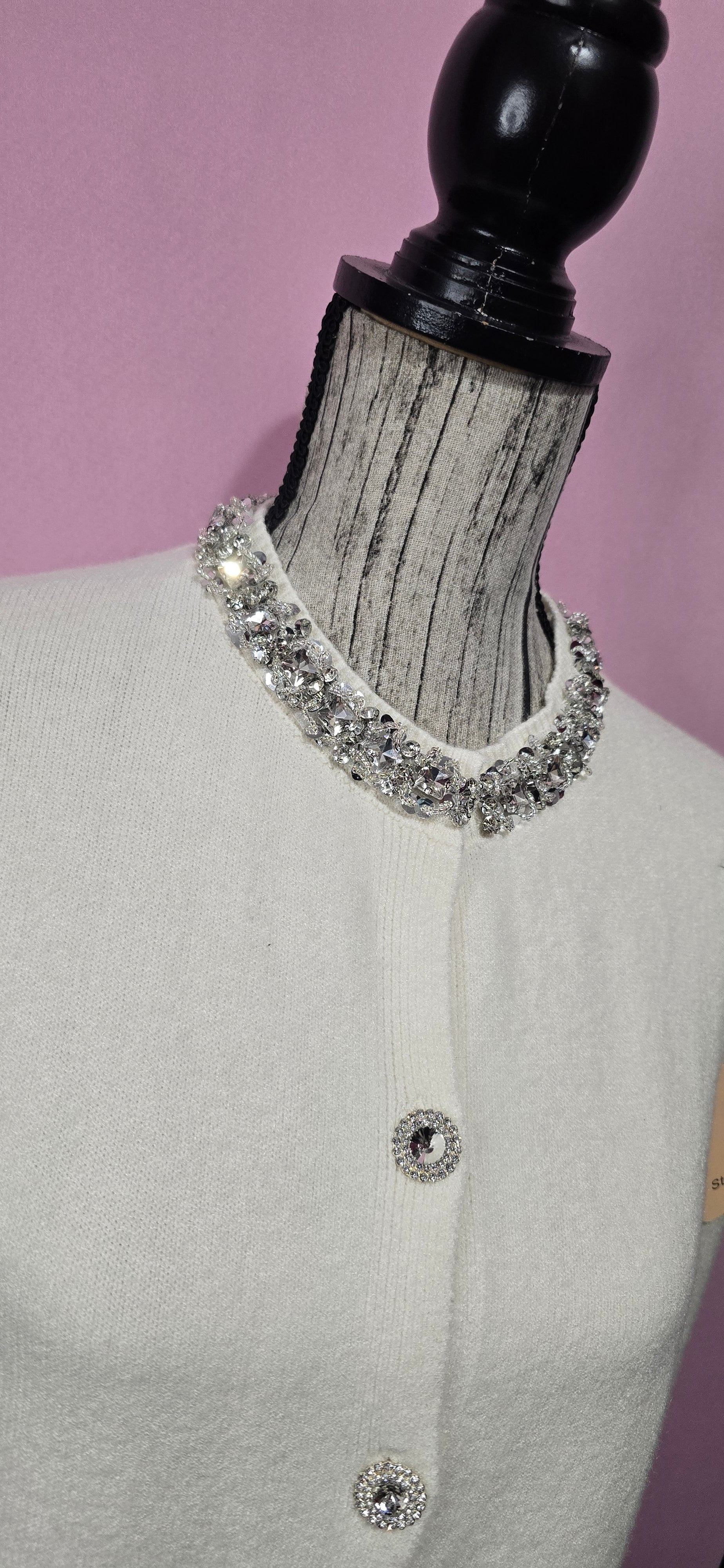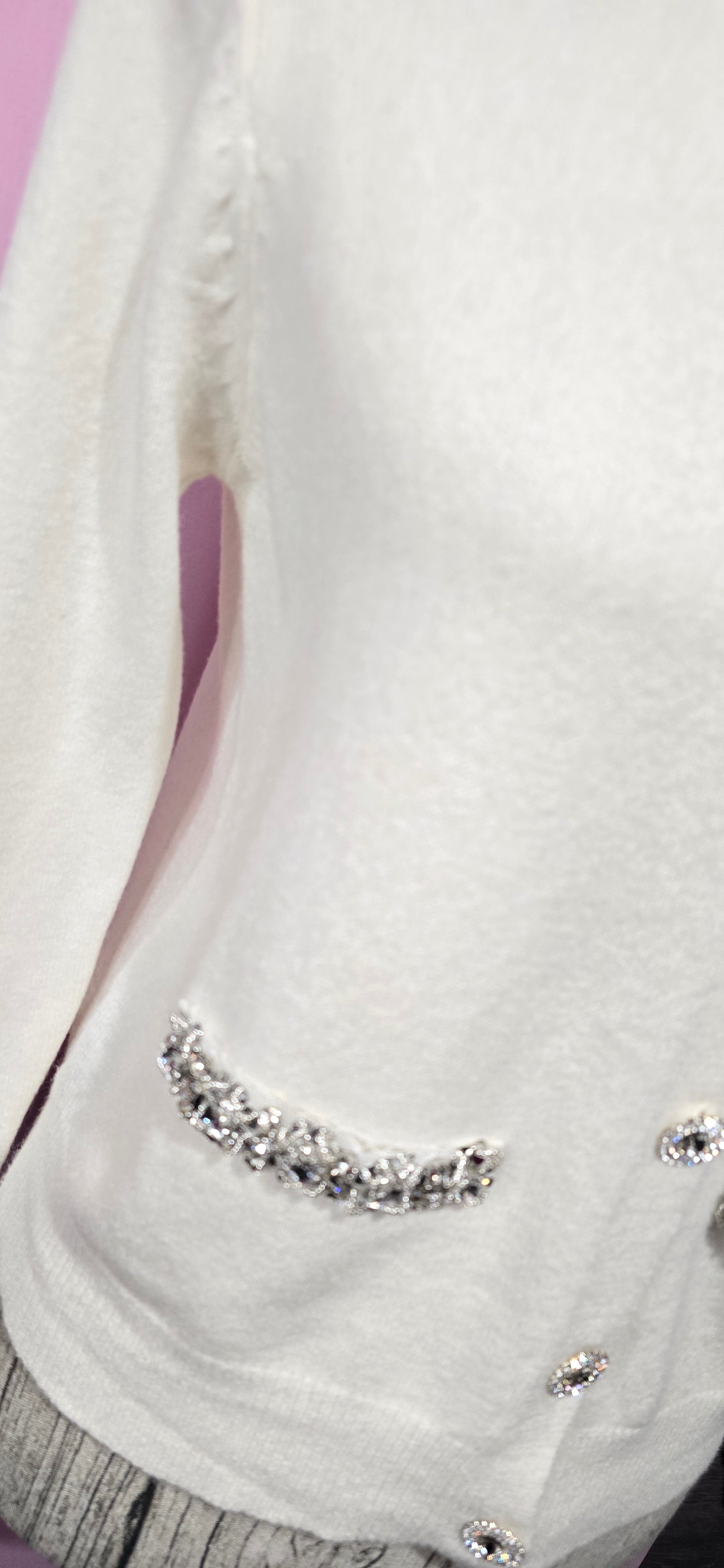 Cardigan elegante in tonalità panna impreziosito da dettagli strass che catturano la luce con raffinatezza. Perfetto per chi desidera un capo versatile che unisce comfort e stile sofisticato. Indossalo su un abito per occasioni speciali o abbinalo a jeans per un look casual chic. La qualità del tessuto garantisce morbidezza e durabilità nel tempo, mentre gli strass aggiungono quel tocco di glamour che fa la differenza. Un must-have per la tua collezione.