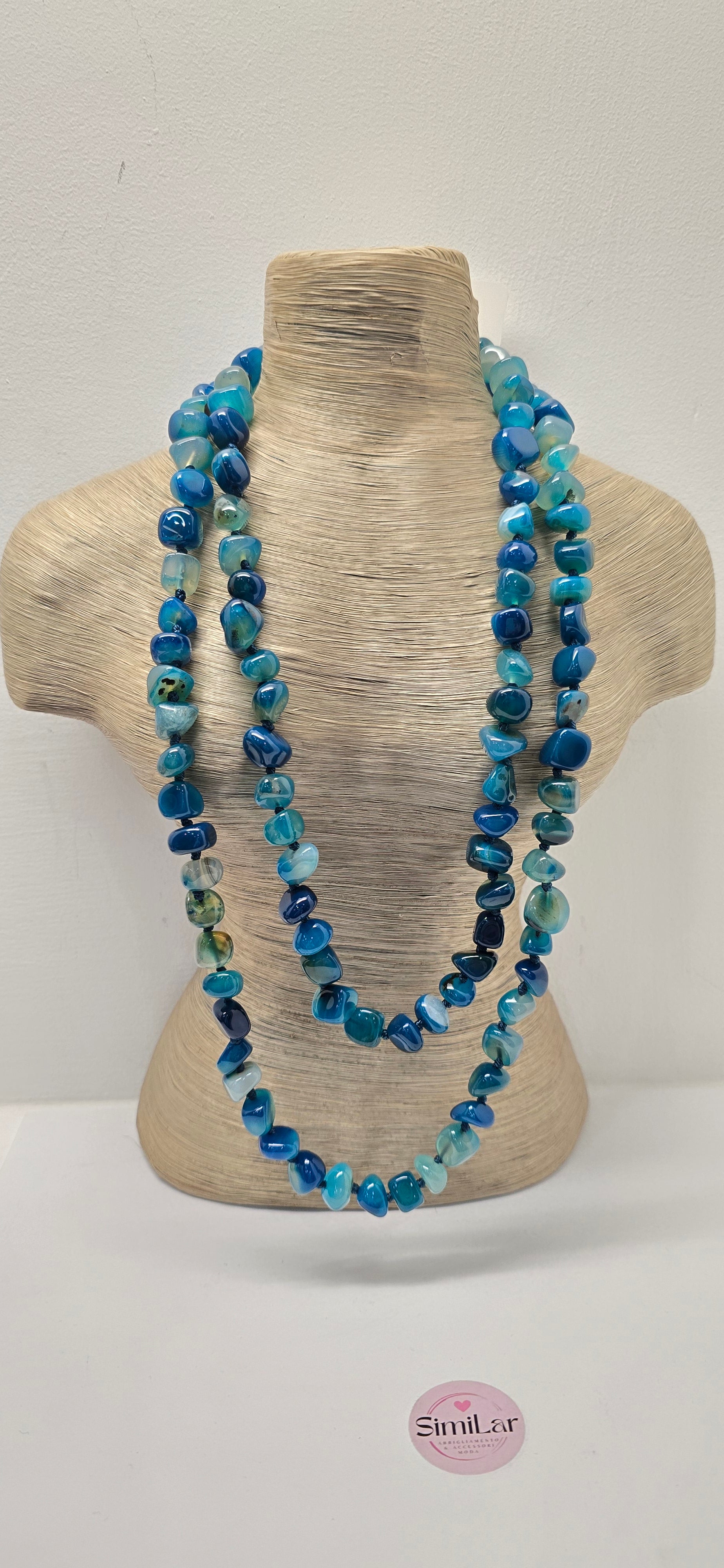COLLANA INFILATA A NODI IN AGATA NATURALE E RINFORZATA DI COLORE A SASSO DI FORMA IRREGOLARE. LUNGHEZZA 110CM CIRCA.