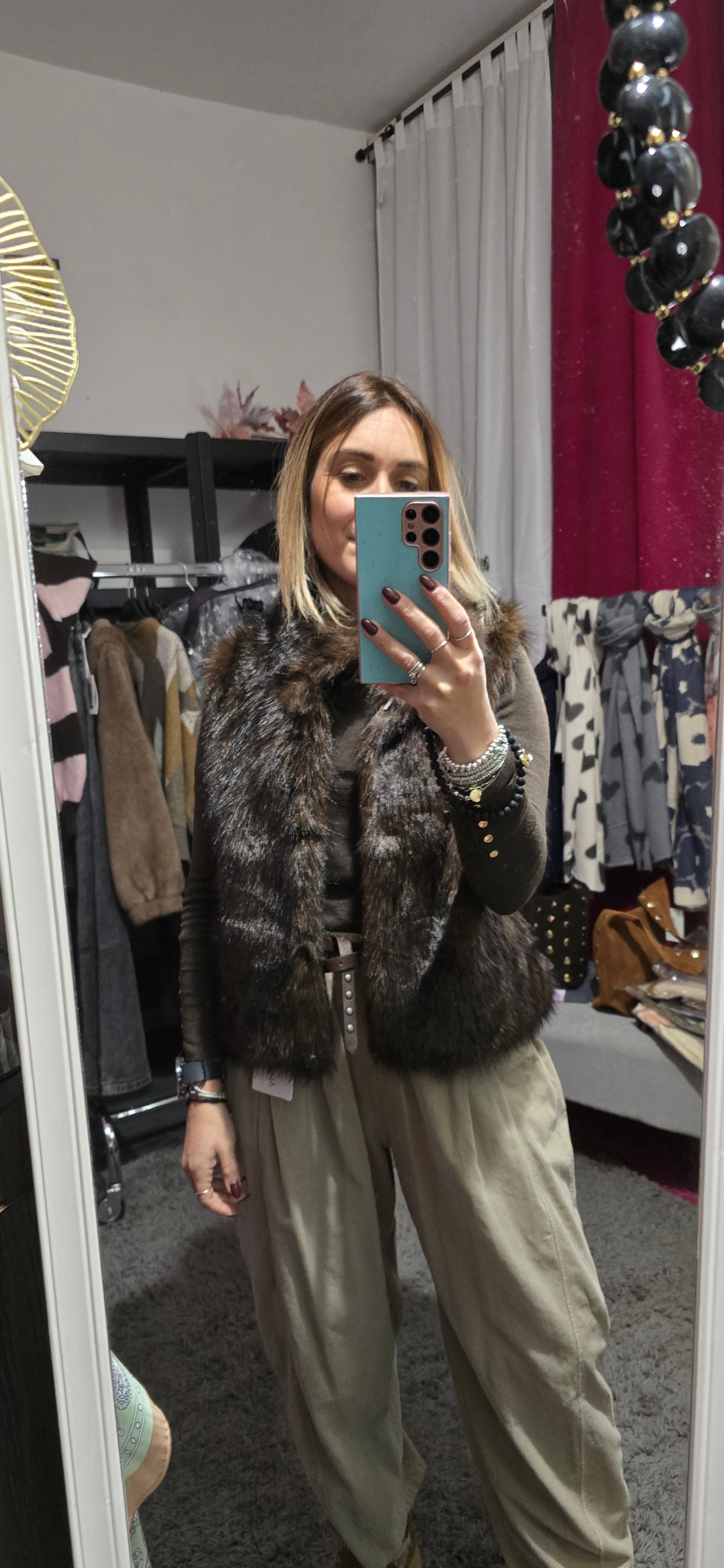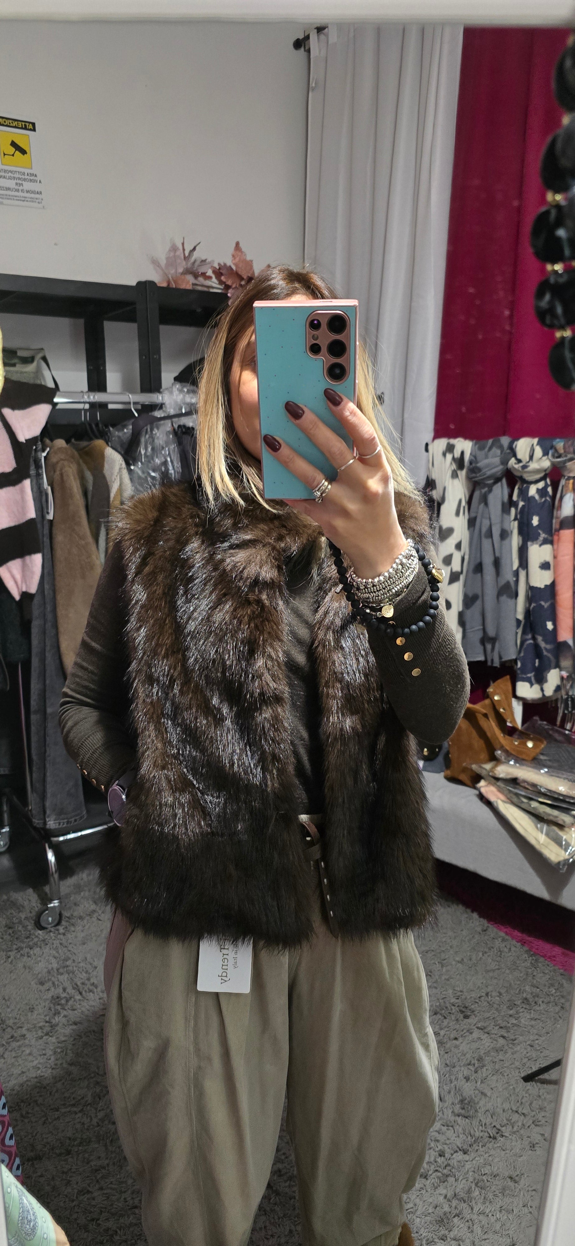 Questo elegante gilet in ecopelliccia marrone è il capo perfetto per aggiungere calore e stile al tuo guardaroba. Realizzato con materiali eco-consapevoli, offre il lusso della pelliccia senza compromessi etici. La tonalità marrone versatile si abbina facilmente a qualsiasi outfit, dalle combinazioni casual ai look più sofisticati. Ideale per le stagioni intermedie, il gilet garantisce comfort e una silhouette flattering. Un'opzione consapevole per chi desidera eleganza responsabile.