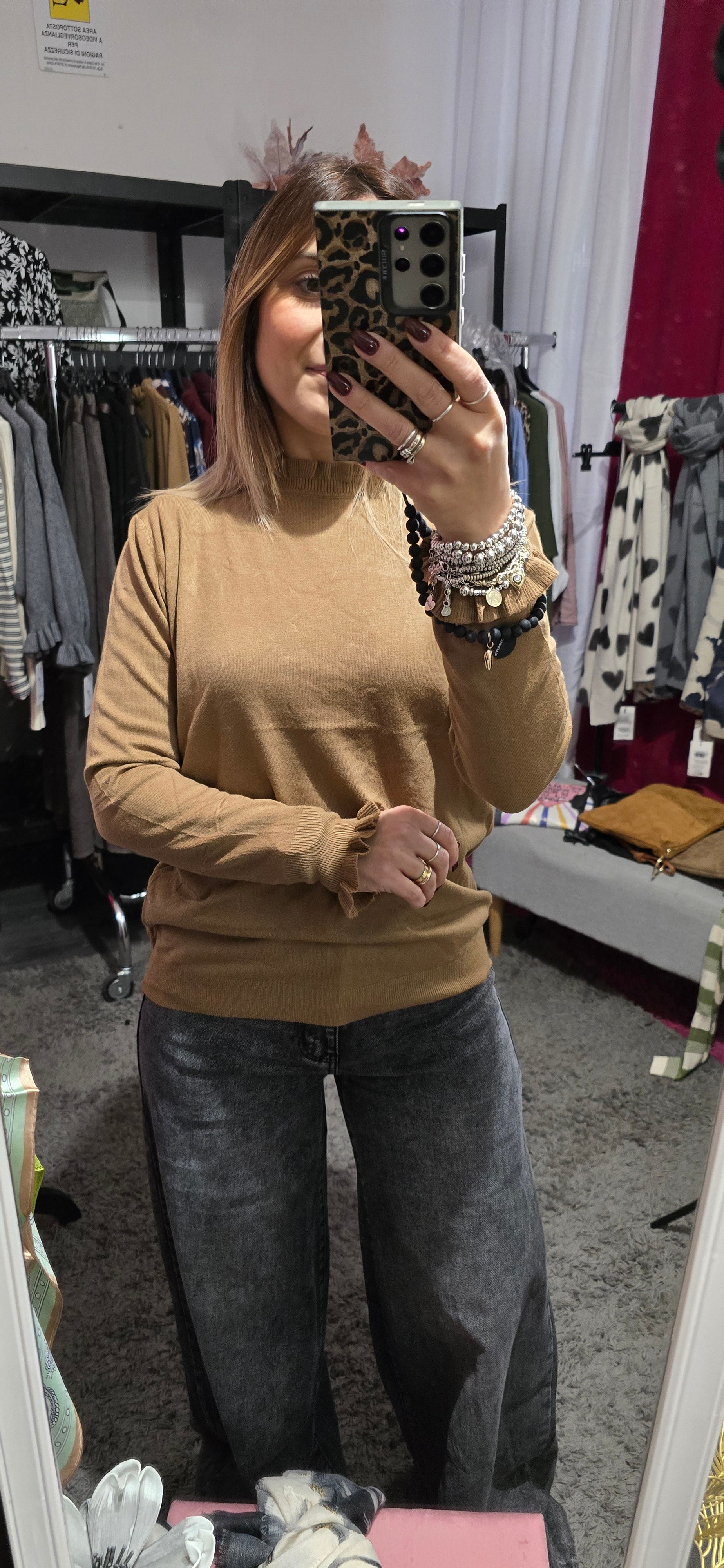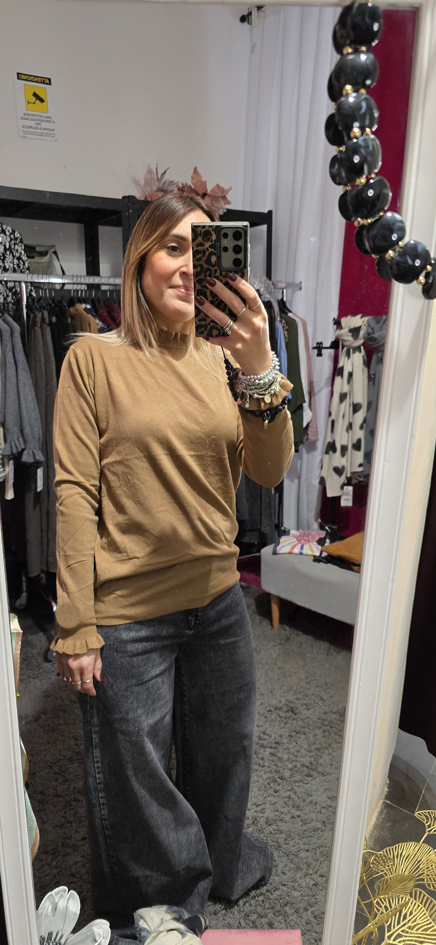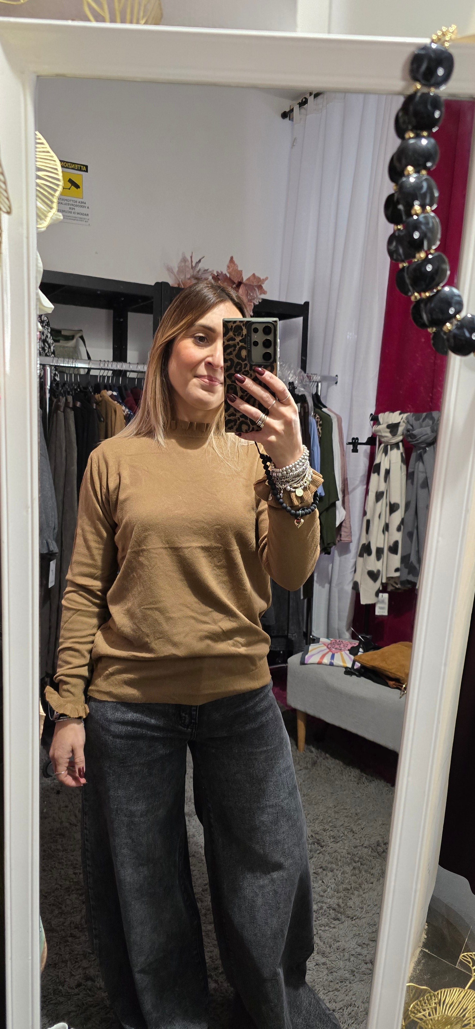 Maglia elegante in viscosa con collo lupetto che valorizza il décolleté e maniche caratterizzate da volant delicati. Taglia unica, perfetta per chi ama il comfort senza rinunciare allo stile. Il tessuto morbido e fluido della viscosa garantisce una vestibilità impeccabile e una sensazione di benessere durante tutto il giorno. Un capo versatile ideale per creare look sofisticati sia in occasioni casual che più formali.