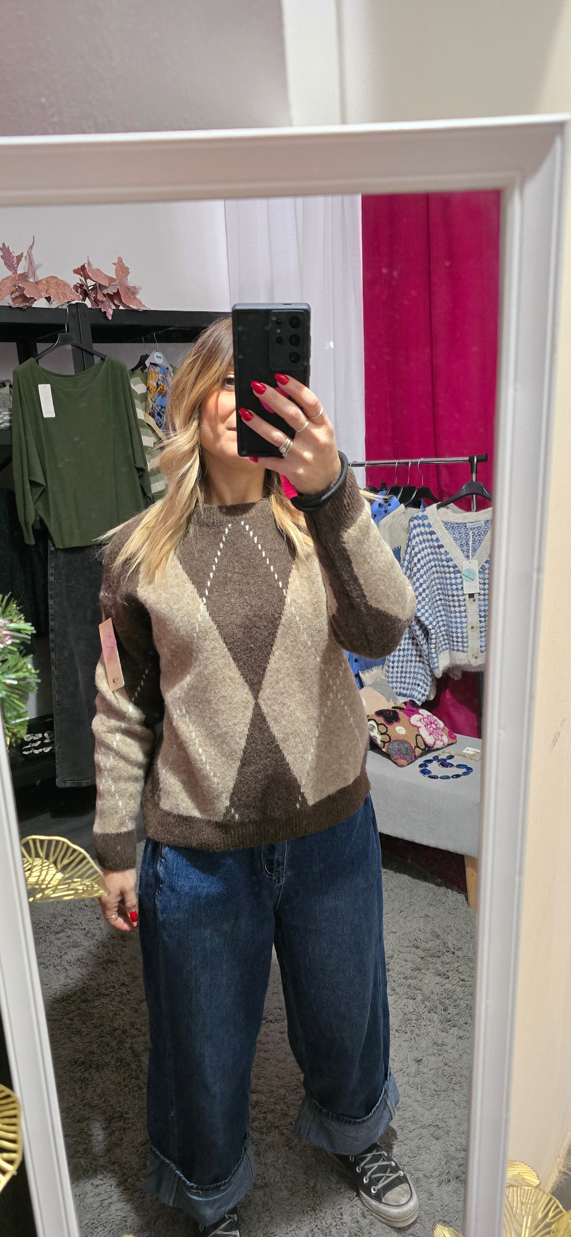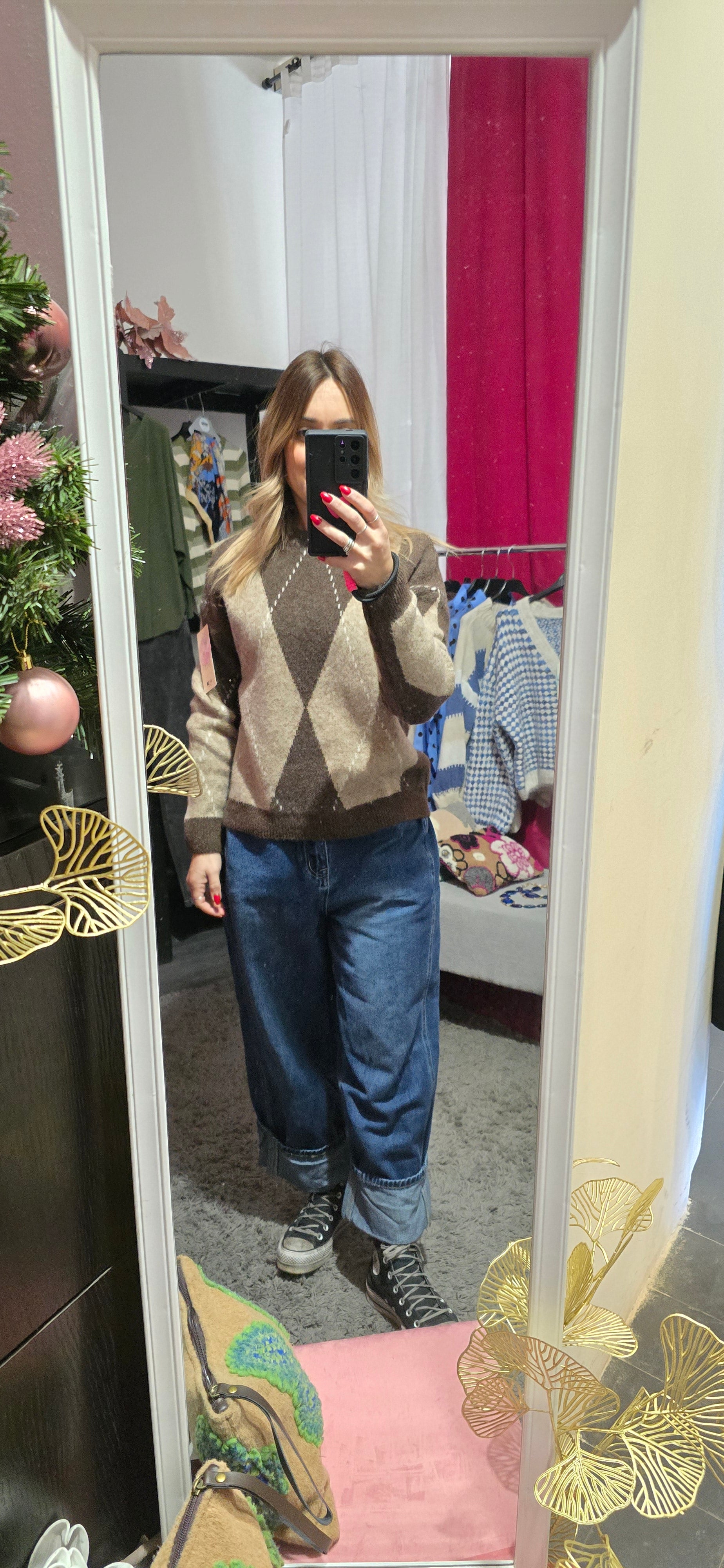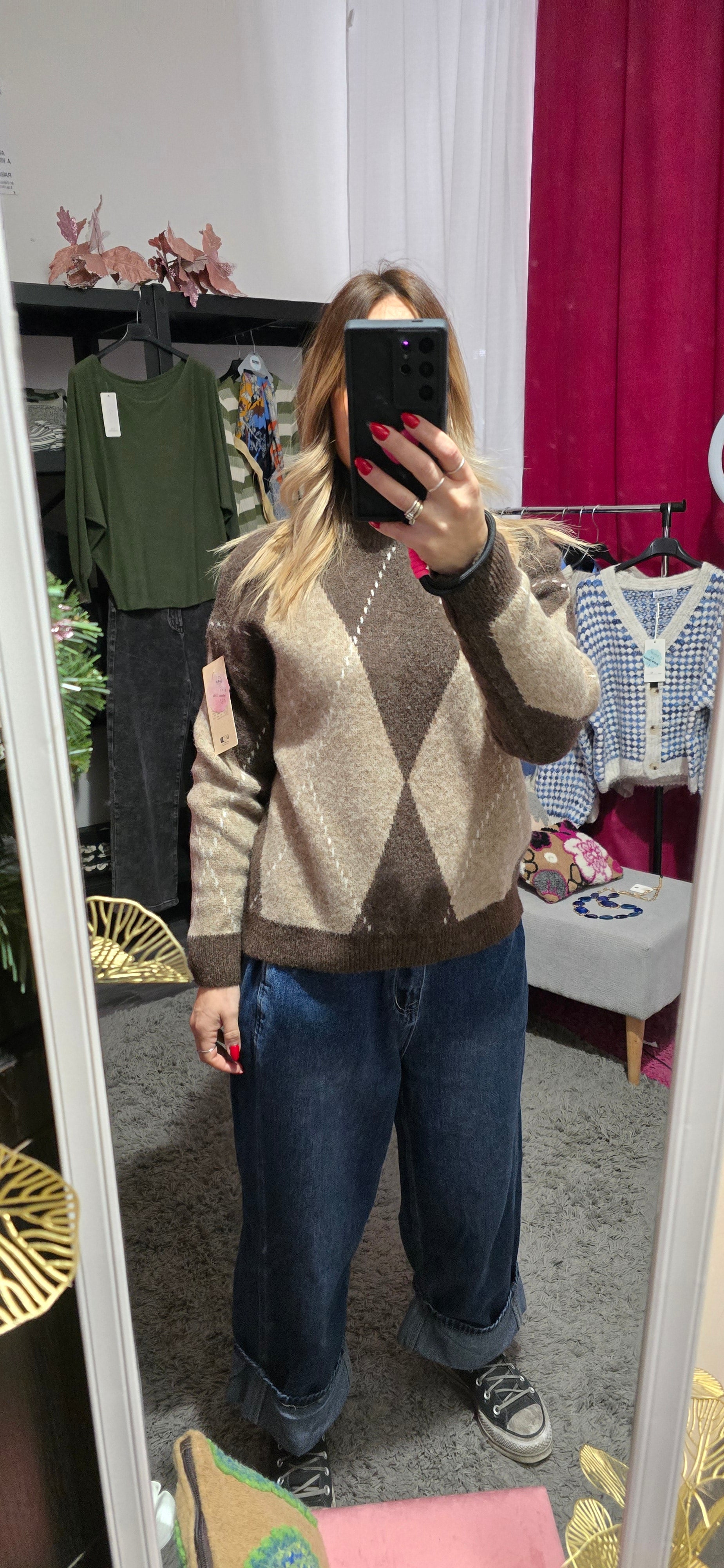Maglia in morbido cotone con un elegante motivo a rombi in tonalità moro. Il design geometrico conferisce un tocco sofisticato a qualsiasi outfit, perfetto per creare look versatili dal giorno alla sera. La vestibilità comoda e il tessuto di qualità la rendono ideale per indossarla in ogni occasione, garantendo stile e praticità senza compromessi.