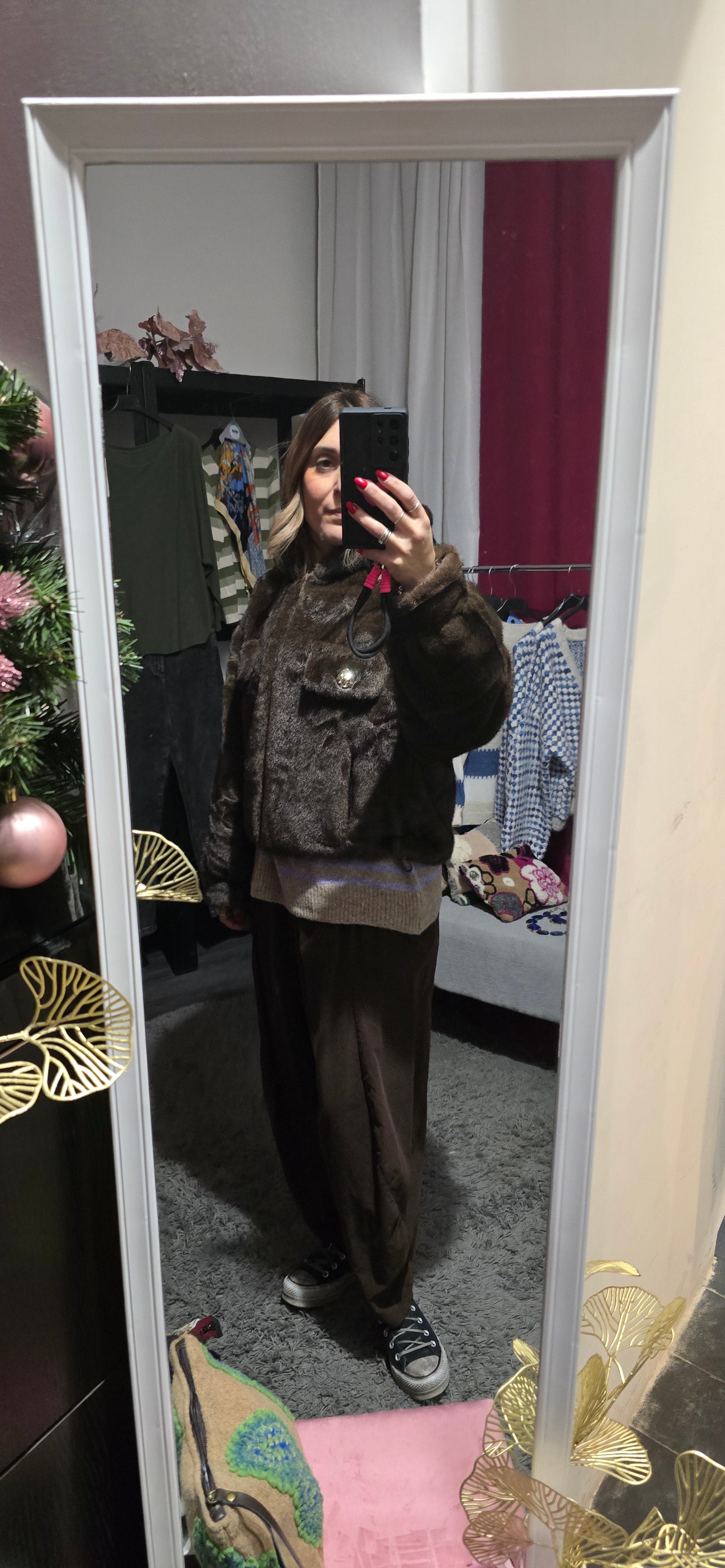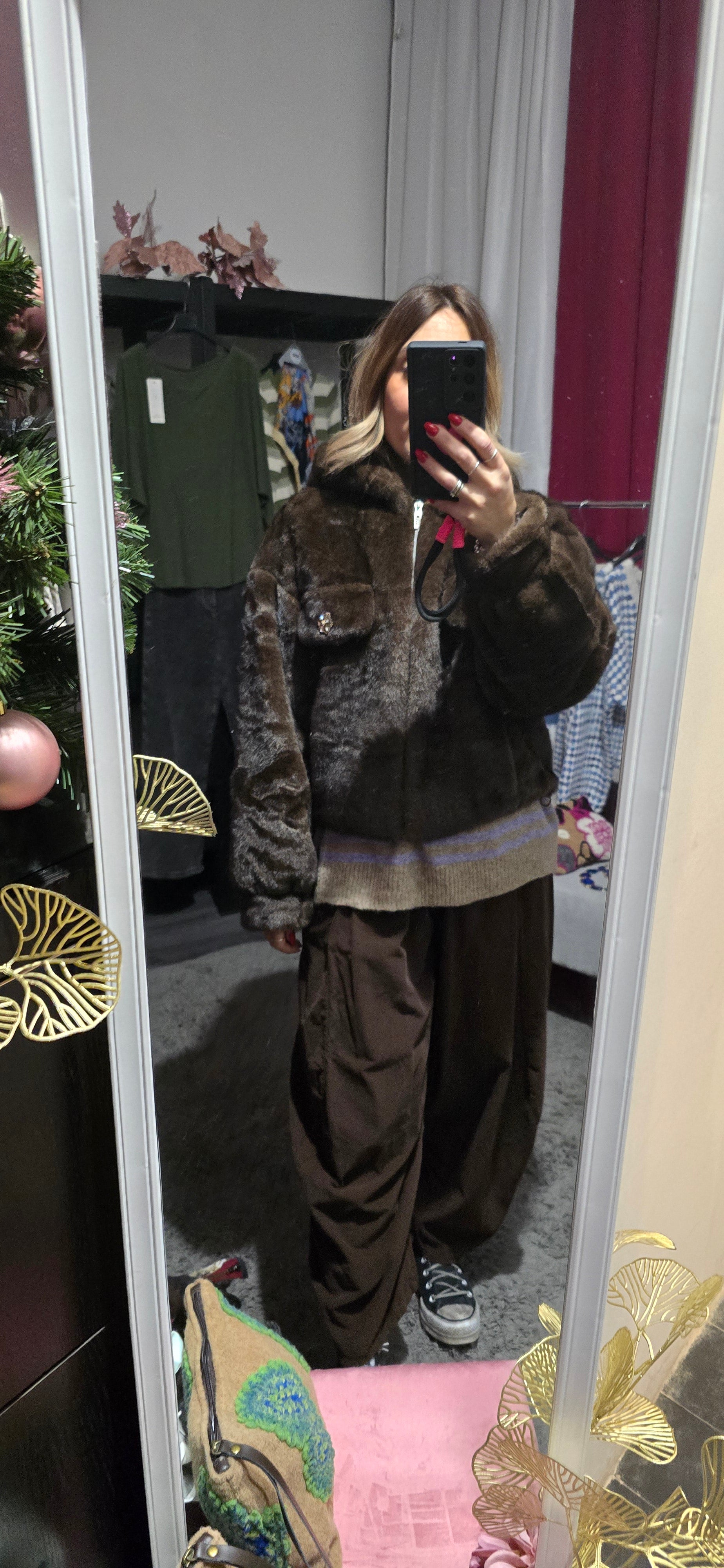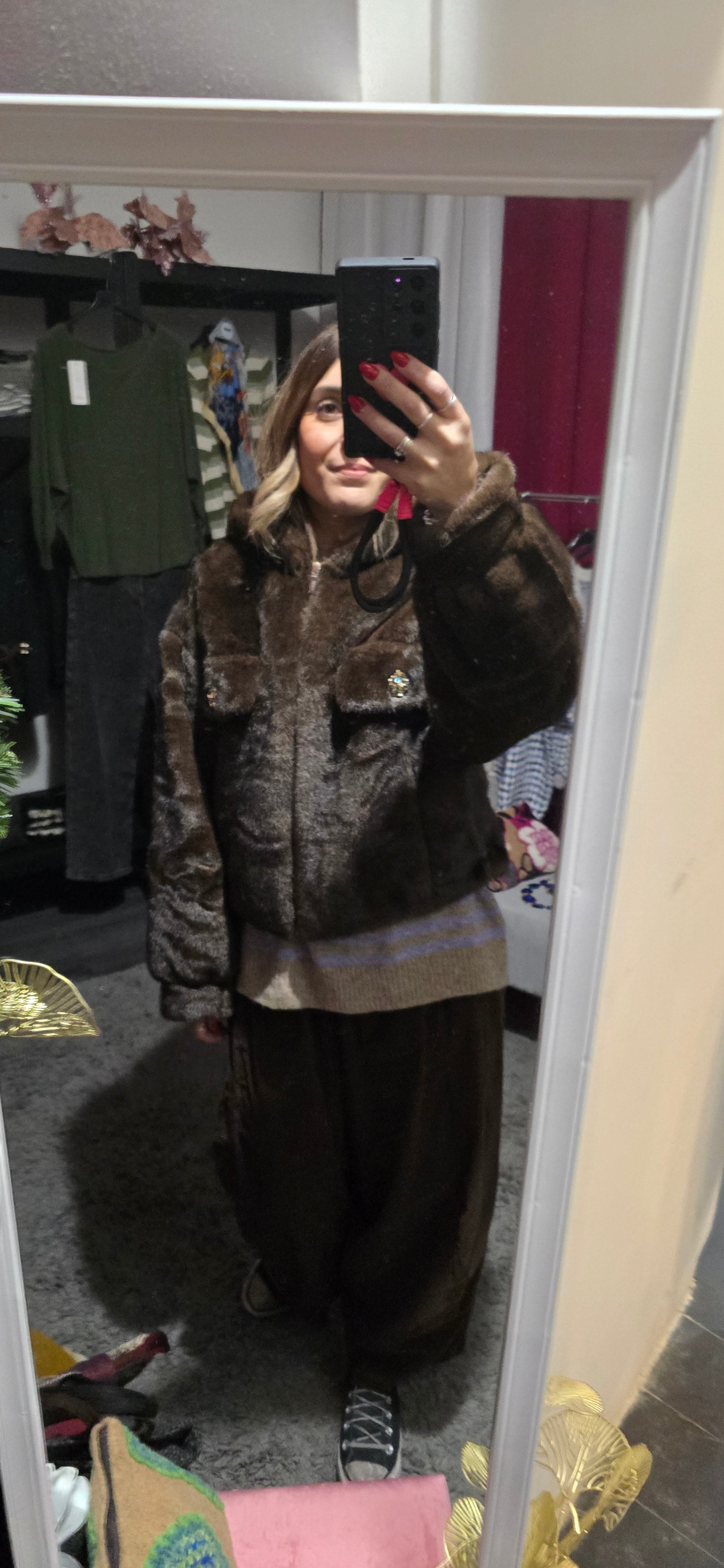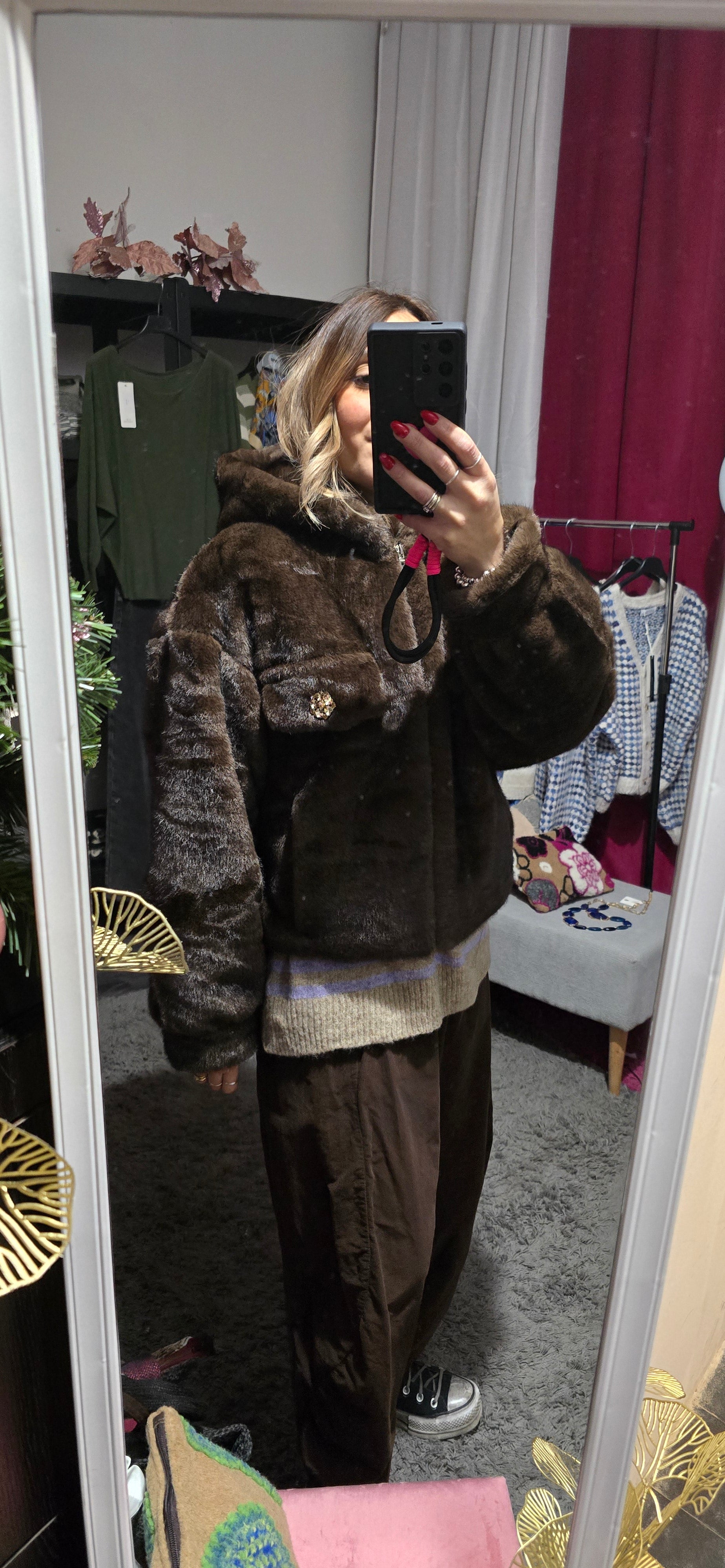 Pellicciotto realizzato in materiale ecologico dal colore moro elegante e sofisticato. Il cappuccio integrato offre protezione extra durante le giornate più fredde, mentre il design versatile si abbina facilmente a qualsiasi outfit. Perfetto per chi ricerca stile e sostenibilità senza compromessi. Un capo essenziale che unisce comfort, praticità e consapevolezza ambientale per un guardaroba consapevole.