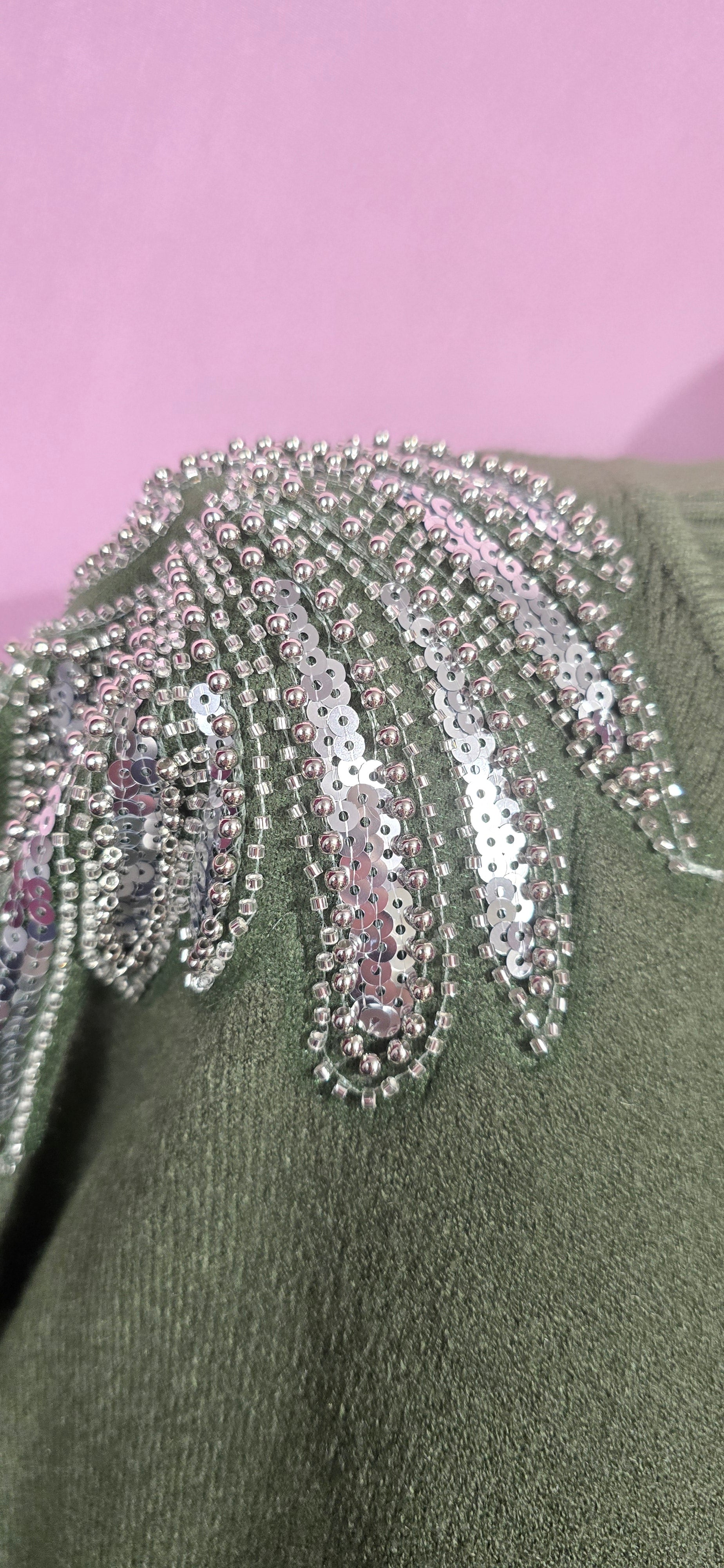 Pull in morbida lana con elegante decorazione a strass verde foglia posizionata sulle spalle. Un dettaglio raffinato che cattura la luce, perfetto per aggiungere un tocco di glamour ai tuoi look quotidiani. Ideale per chi ama gli accessori che fanno la differenza senza essere invadenti. Versatile e chic, si abbina facilmente con jeans, gonne o pantaloni eleganti.