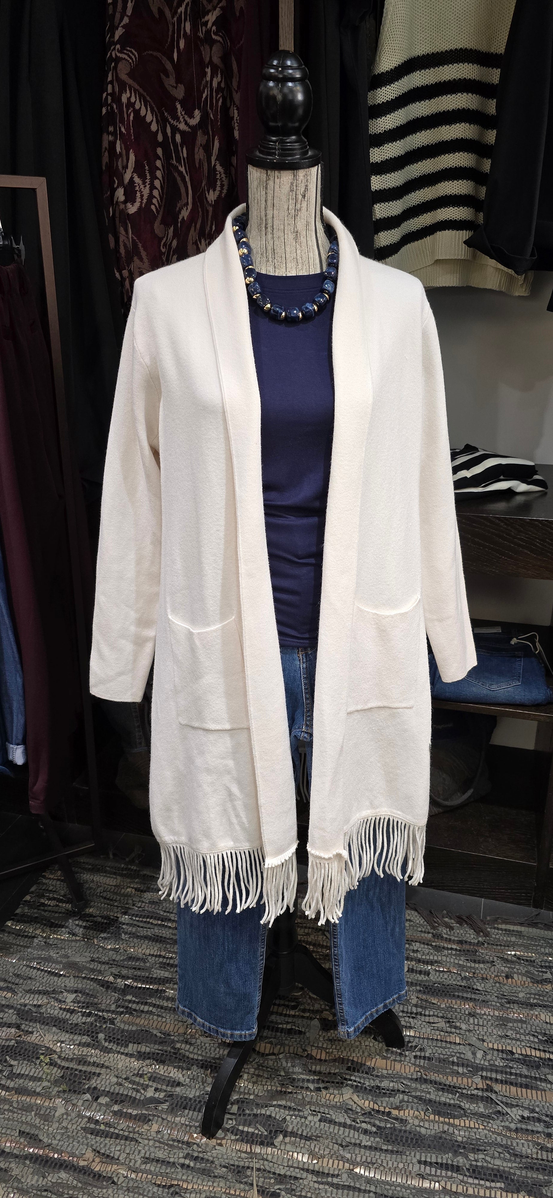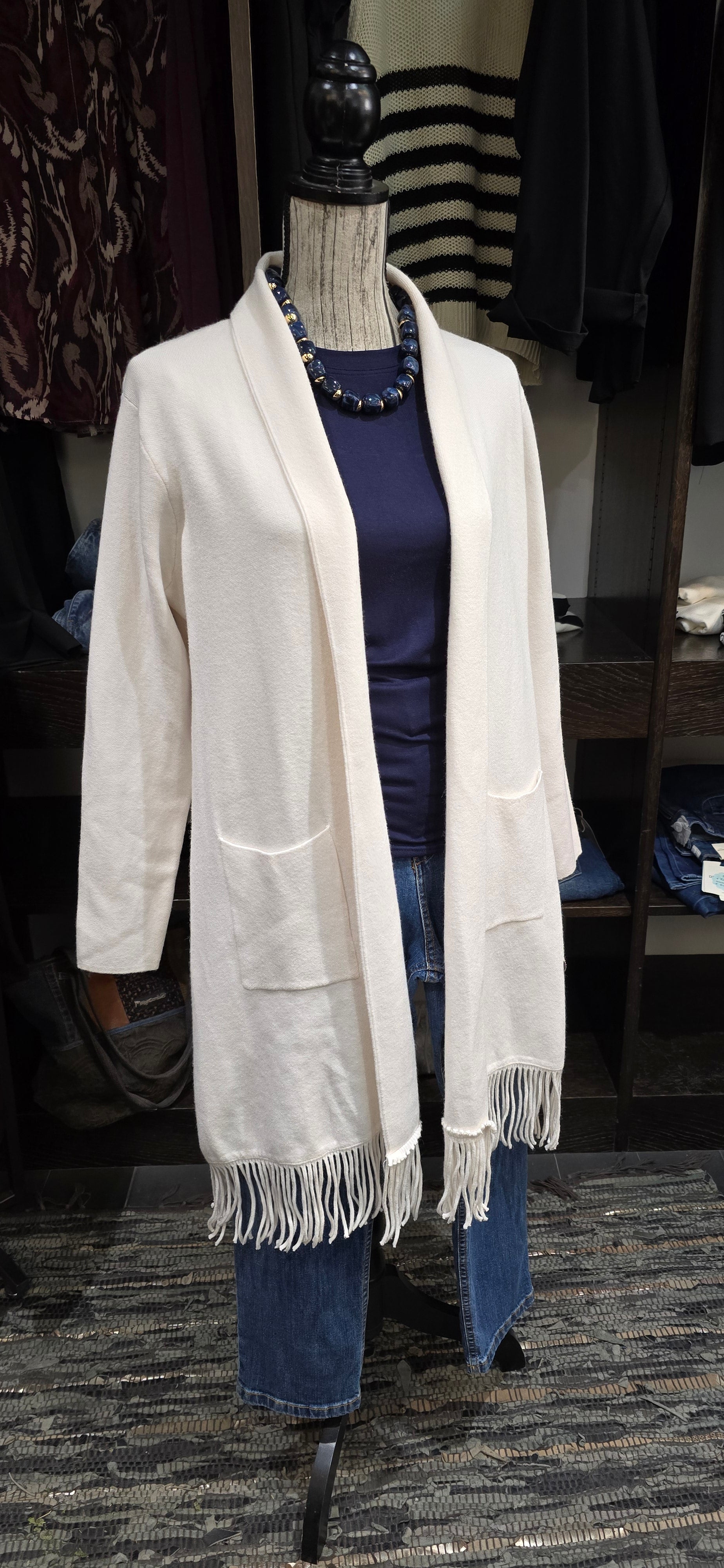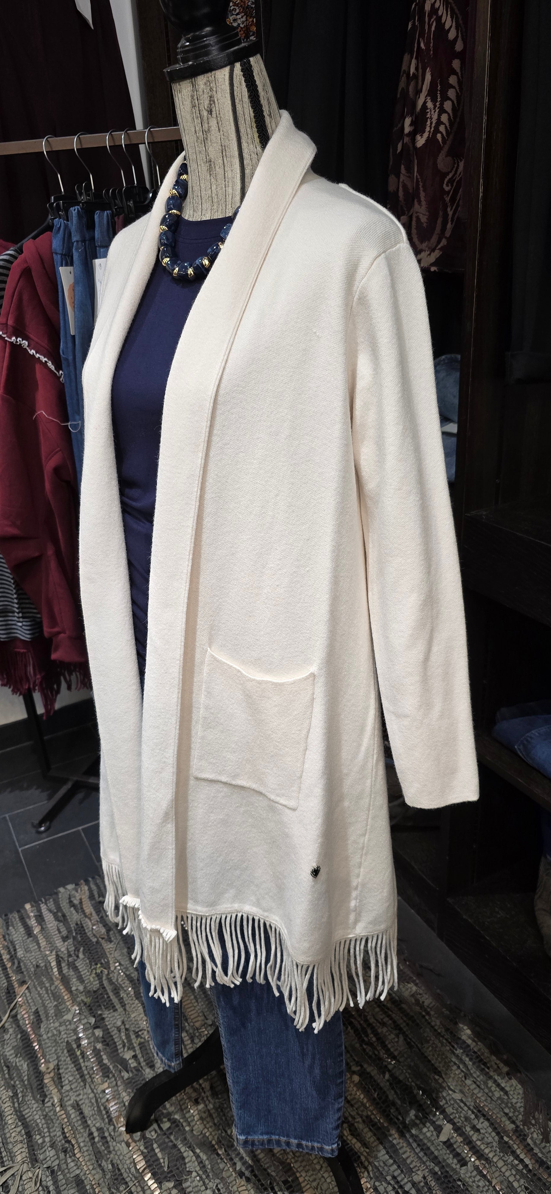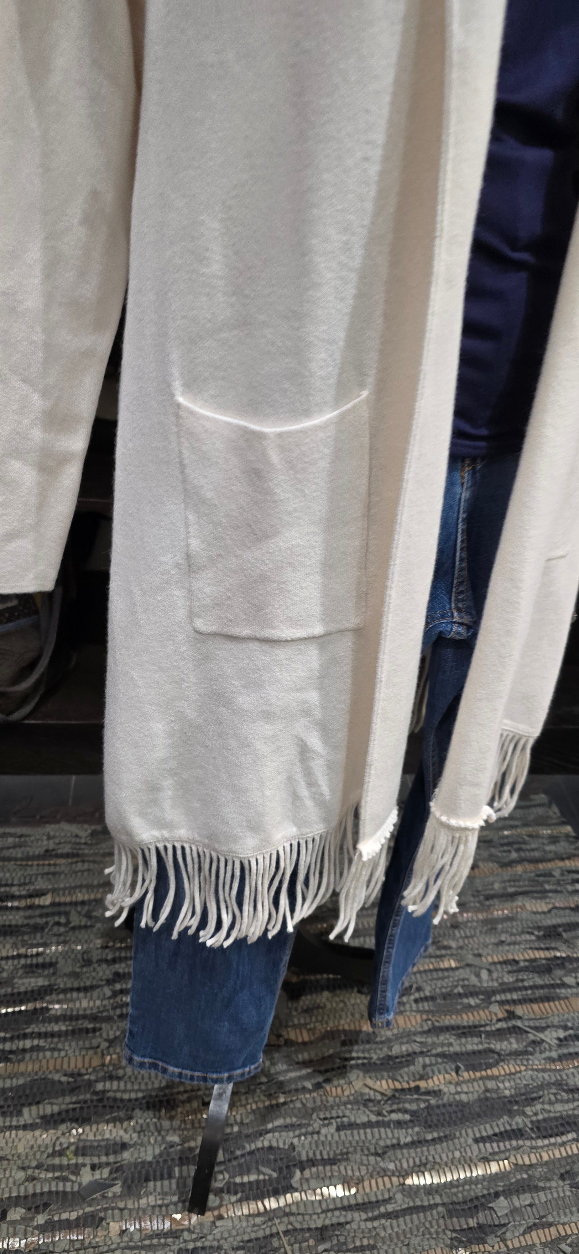 Questo spolverino panna, realizzato in misto viscosa, unisce comfort e stile grazie alla sua morbidezza e leggerezza. Le pratiche tasche laterali aggiungono funzionalità senza rinunciare all'eleganza, mentre le frange donano un tocco originale e dinamico al capo, perfetto per completare ogni outfit con personalità.